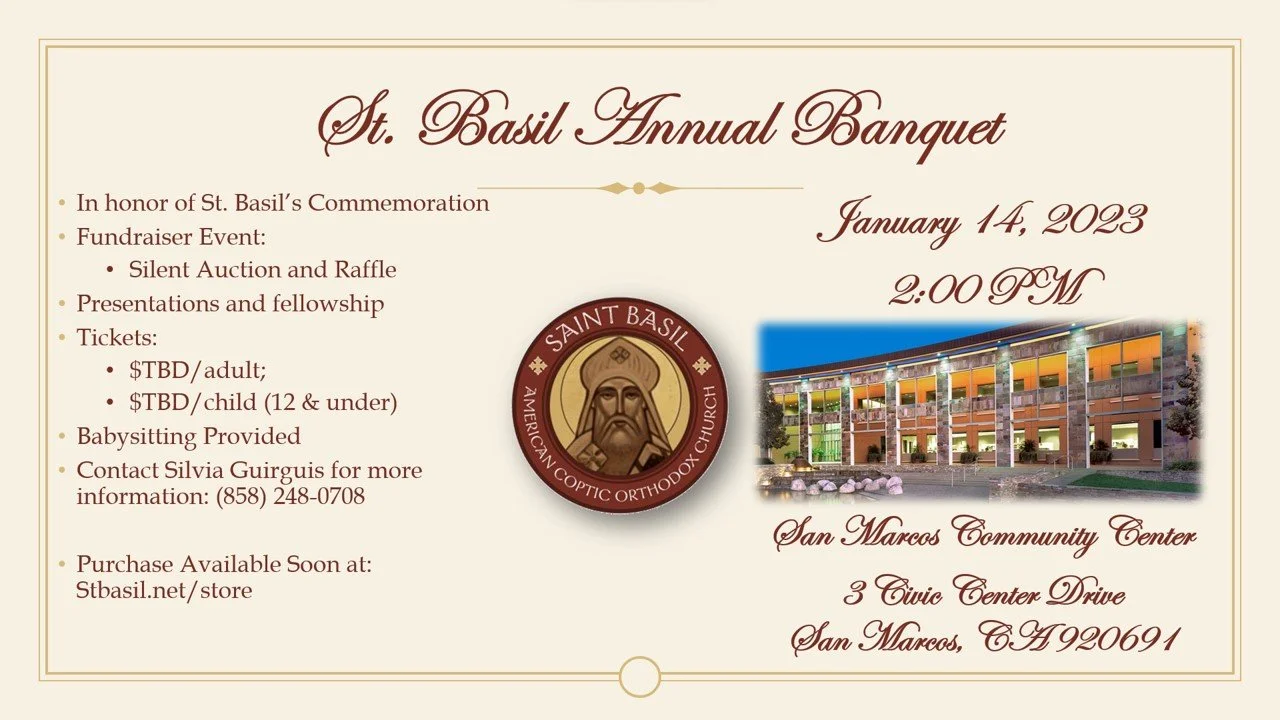 Mark your calendars for 2:00PM - 6:00 PM , on January 14th for St. Basil’s annual banquet in celebration of St. Basil’s annual commemoration (January 14th) for a wonderful night with family and friends! Tickets will be available soon!