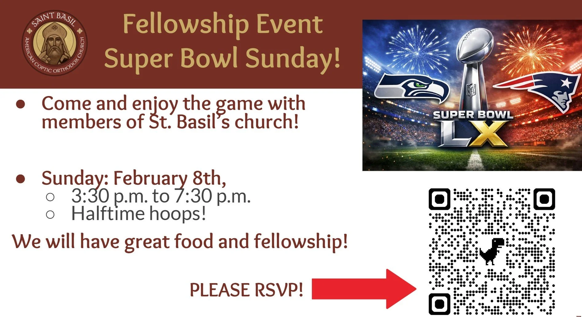 Watch Superbowl LX, enjoy food, and enjoy fellowship! Please RSVP by scanning the QR code below. Please RSVP by clicking here!